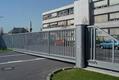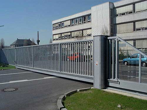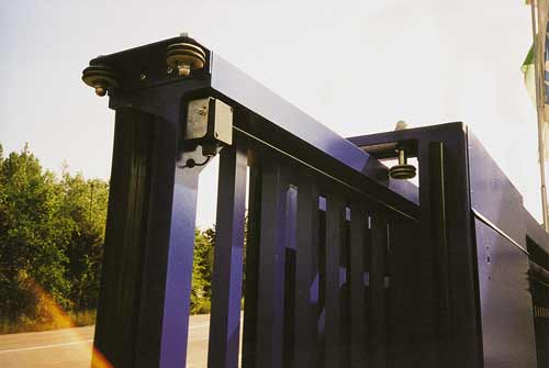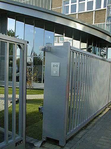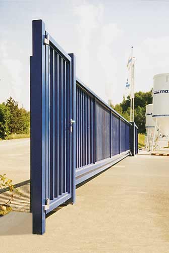 Freitragende Schiebetore aus verwindungsfrei geschweissten Aluminiumprofilen; im Torkörper in Spezialsockelprofil integrierte Führungsrollen; elektrisch angetrieben, mit Steuerungs- und Sicherheitseinrichtungen. Torfüllung aus Rechteckrohren, Gittermatten oder geschlossenen Blechen. Sonderfüllungen wie Lochbleche, Verglasungen auf Anfrage.
