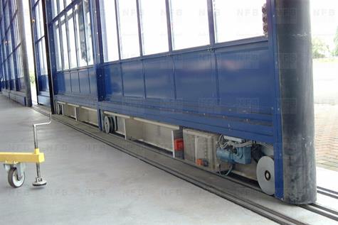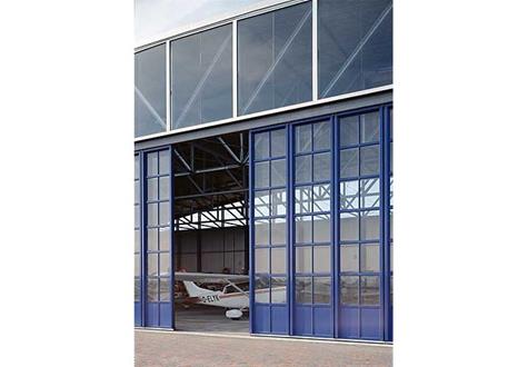 Vollflächig verglaste Teleskop-Schiebetore in Hangartor-Ausführung mit den Maßen 50 x 5,6 m bzw. 30 x 5,6 m als Gebäudeabschluss für eine Hangar-Werfthalle.
